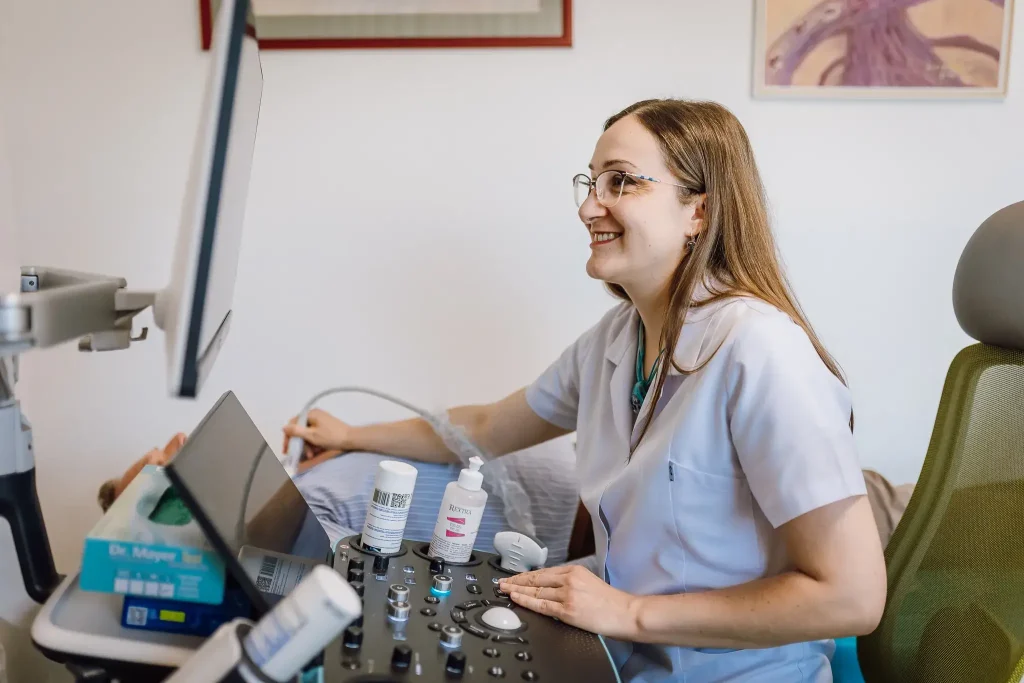 Ecografie tiroidiană (echo): Examinarea precisă a dimensiunii, localizării tiroidei și identificarea inflamațiilor, chisturilor sau tumorilor cu ajutorul ecografiei.